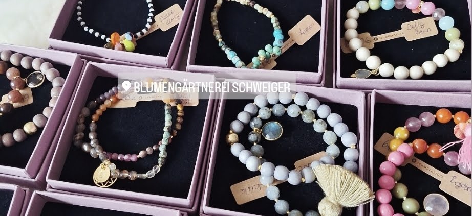Neu bei uns im Blumenladen in Kelheim. Armbänder und Ketten der Marke Schmückstück. Gute Laune garantiert! Aus Edelstein, Holz und Sterling Silber vergoldet. Die Holzperlen werden mit natürlichen Farben gefärbt und die Schmuckstücke werden in Deutschland in liebevoller Handarbeit gefertigt.